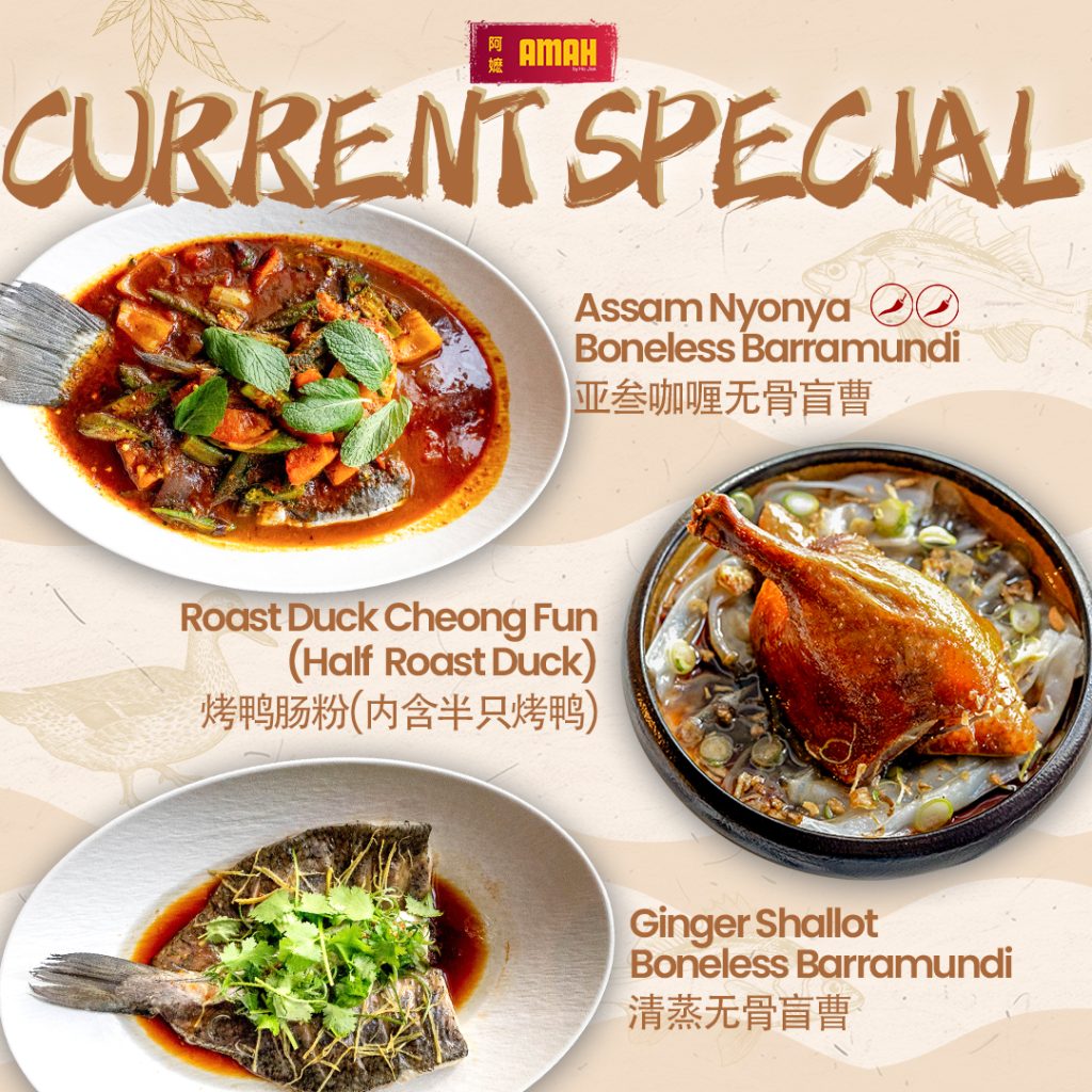 Our new current specials - boneless barramundi – available in Assam Nyonya or Ginger Shallot. Roast Duck Cheong Fun – soft rice rolls, crispy half duck, and sauce that hits all the right notes!
