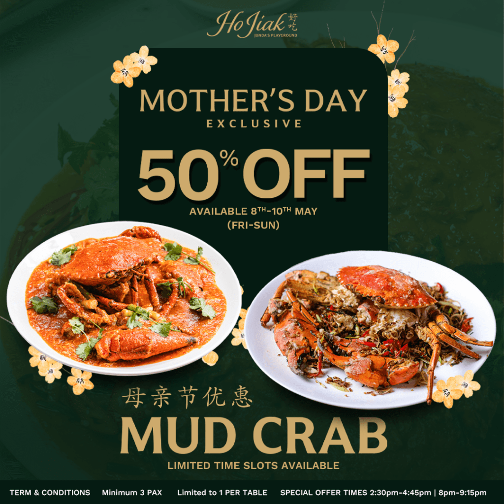 Make Mother’s Day Extra Special with 50% Off Mud Crab. Available on 8th to 10th May, minimum 3 pax to book. T&Cs apply.